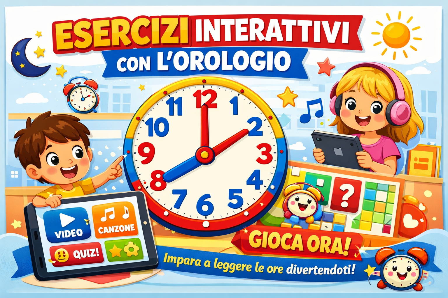 Video lezione, canzone ed esercizi interattivi per aiutare i bambini della scuola primaria a imparare a leggere l'orologio.