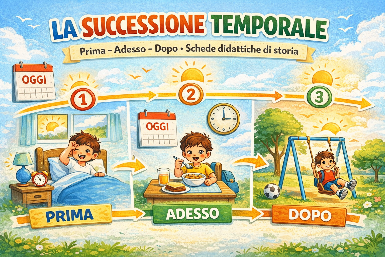 Una raccolta di schede didattiche sulla successione temporale pensata per accompagnare i bambini della scuola primaria nella comprensione di prima, adesso, dopo, dell’ordine cronologico e delle sequenze del tempo in modo semplice, visivo e immediato.